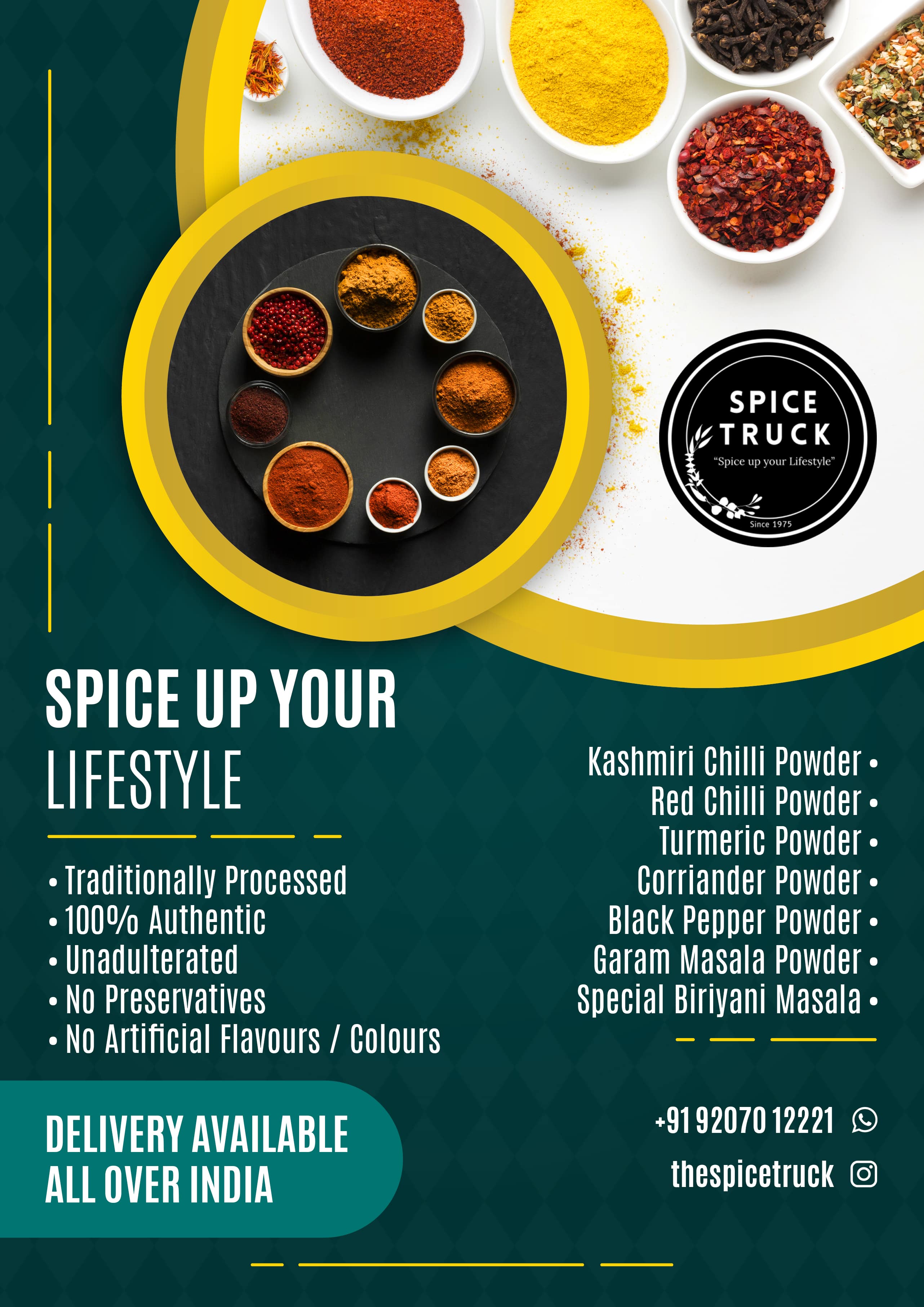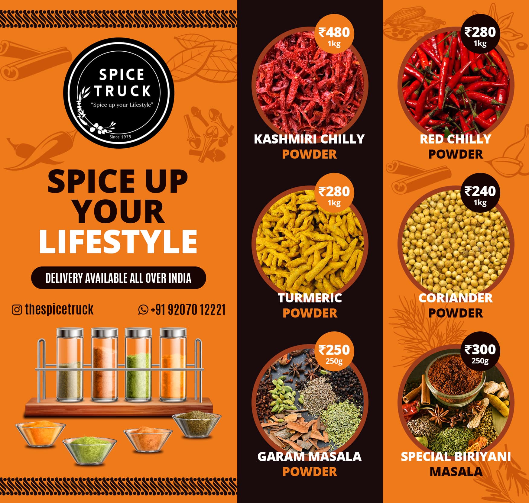 Spice Truck is on its way to bring some colour and aroma to your dining table. Add a few driblets of our premium spices to your dishes and let your taste senses sing. Now, we offer delivery services of our unadulterated flavour all around India. Simply give us a call to place your order. We’ll see to it that the spices arrive on schedule.